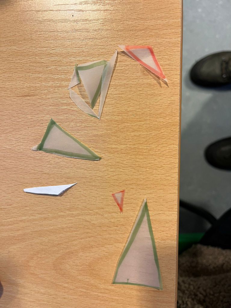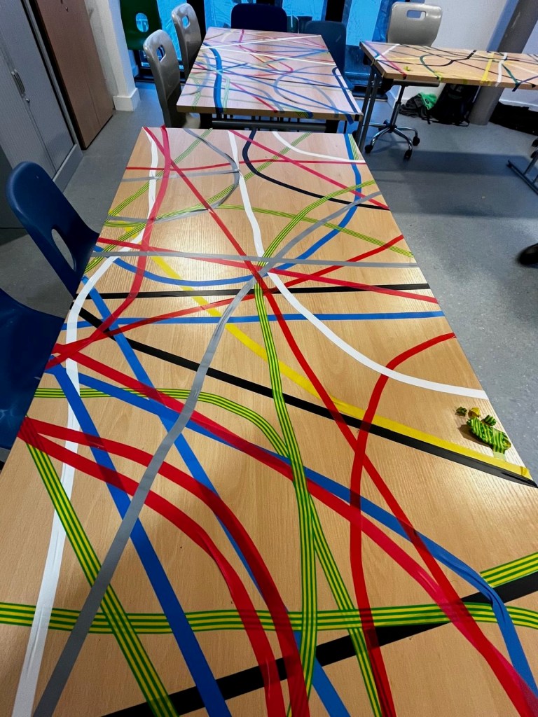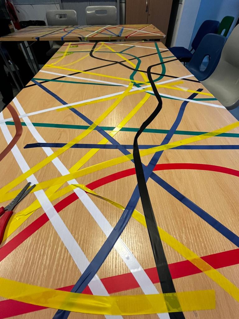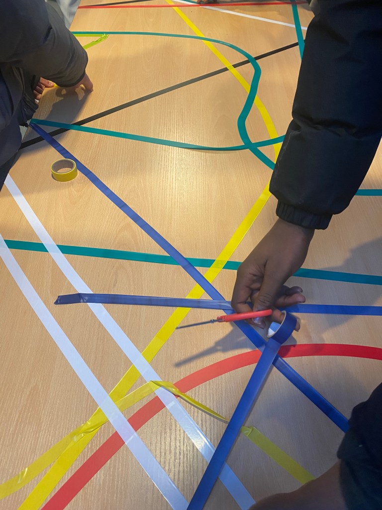 We explored geometric forms using coloured tape on large tables. We created intersecting lines, identified the shapes produced at their crossings, and experimented with reproducing and assembling them. The activity opened a conversation about how shapes emerge through gesture and relation, and how geometry can be experienced as something both playful and surprising.